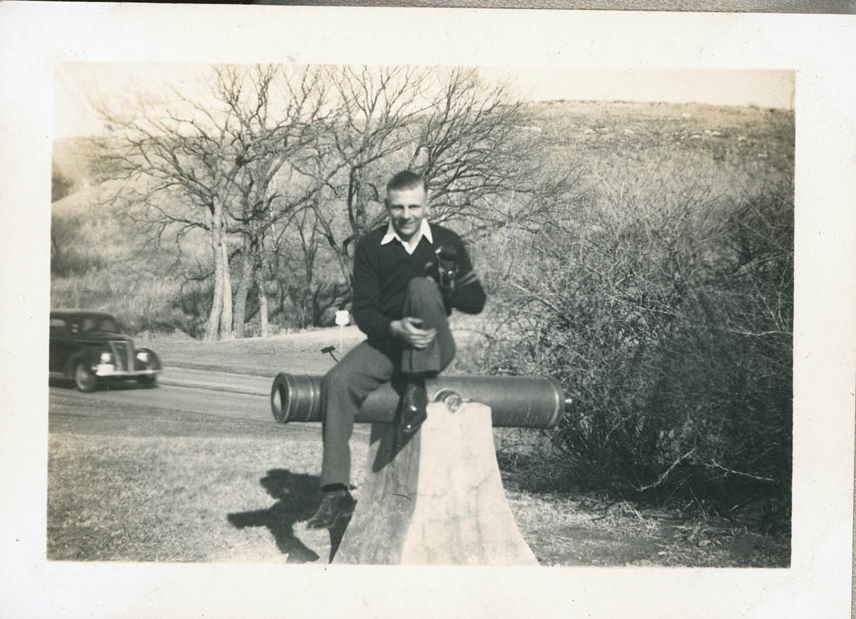 - Snapshot of a man holding a camera istting on a cannon memorial. This is an item in a scrapbook compiled by Mr and Mrs John D Rensink.