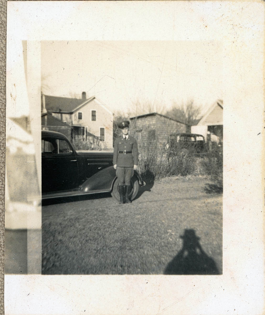 - Snapshot of a man in a military uniform standing by a car. This is an item in a scrapbook compiled by Mr and Mrs John D Rensink.