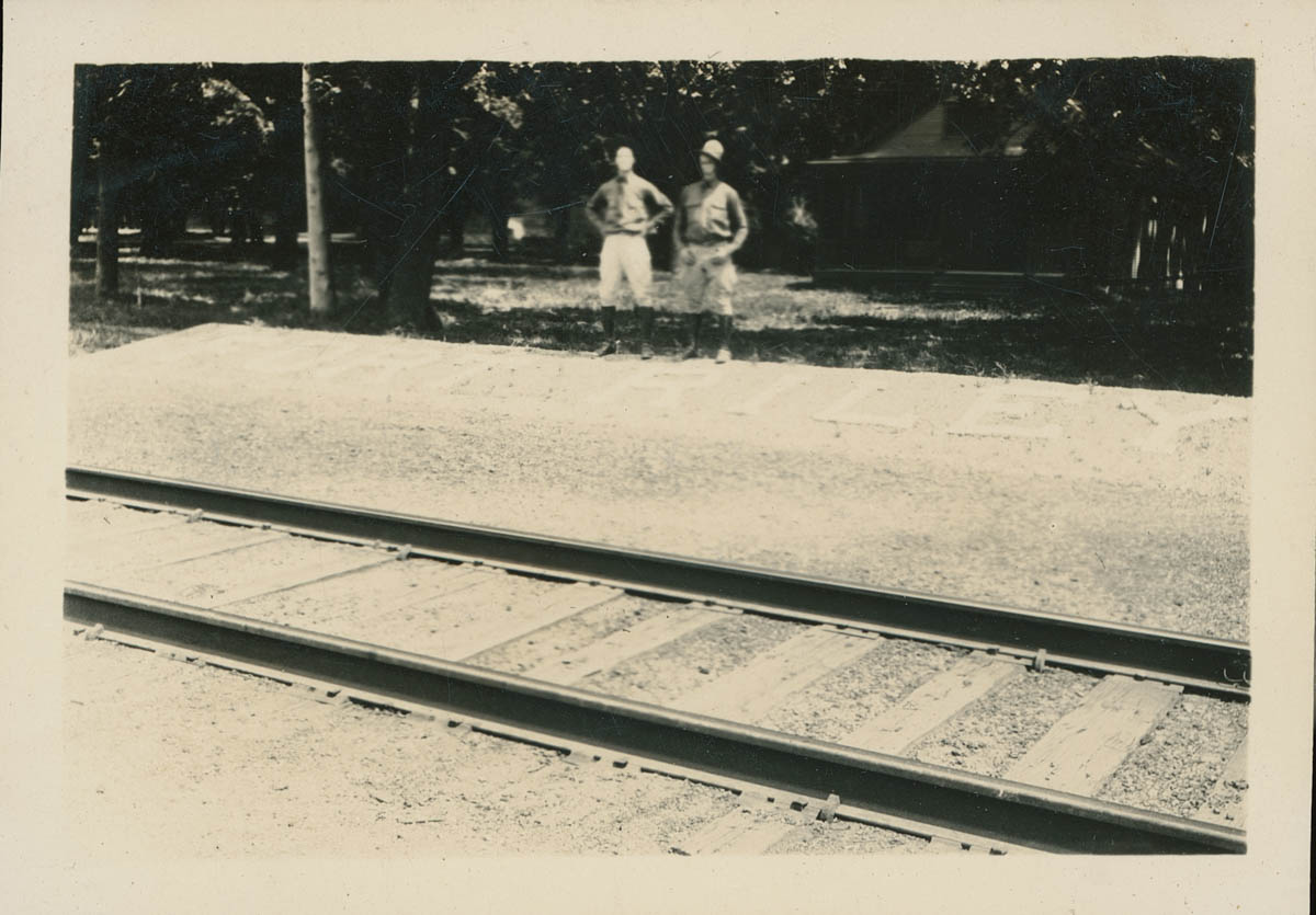 - Snapshot of two men in uniform standing by a railroad track. This is an item in a scrapbook compiled by Mr and Mrs John D Rensink.
