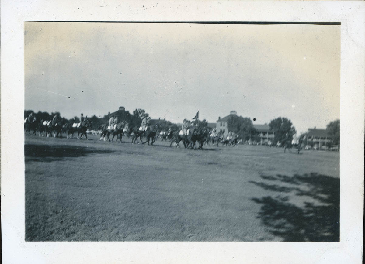 - Snapshot of men in military uniform riding horses in parade on a large field. This is an item in a scrapbook compiled by Mr and Mrs John D Rensink.