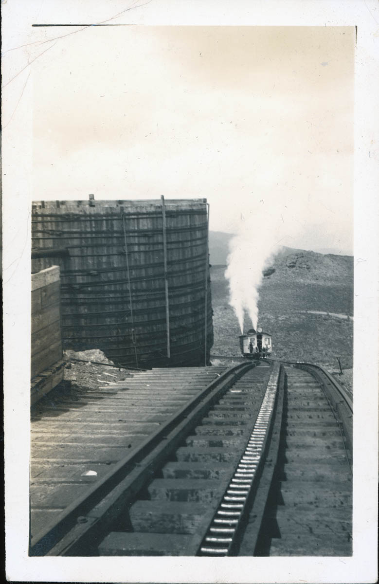 - Snapshot of people on a train car approaching a water tank. This is an item in a scrapbook compiled by Mr and Mrs John D Rensink.