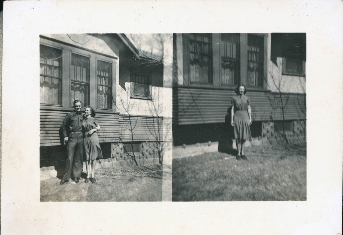 - Two snapshots of a man and woman standing by a house. This is an item in a scrapbook compiled by Mr and Mrs John D Rensink.