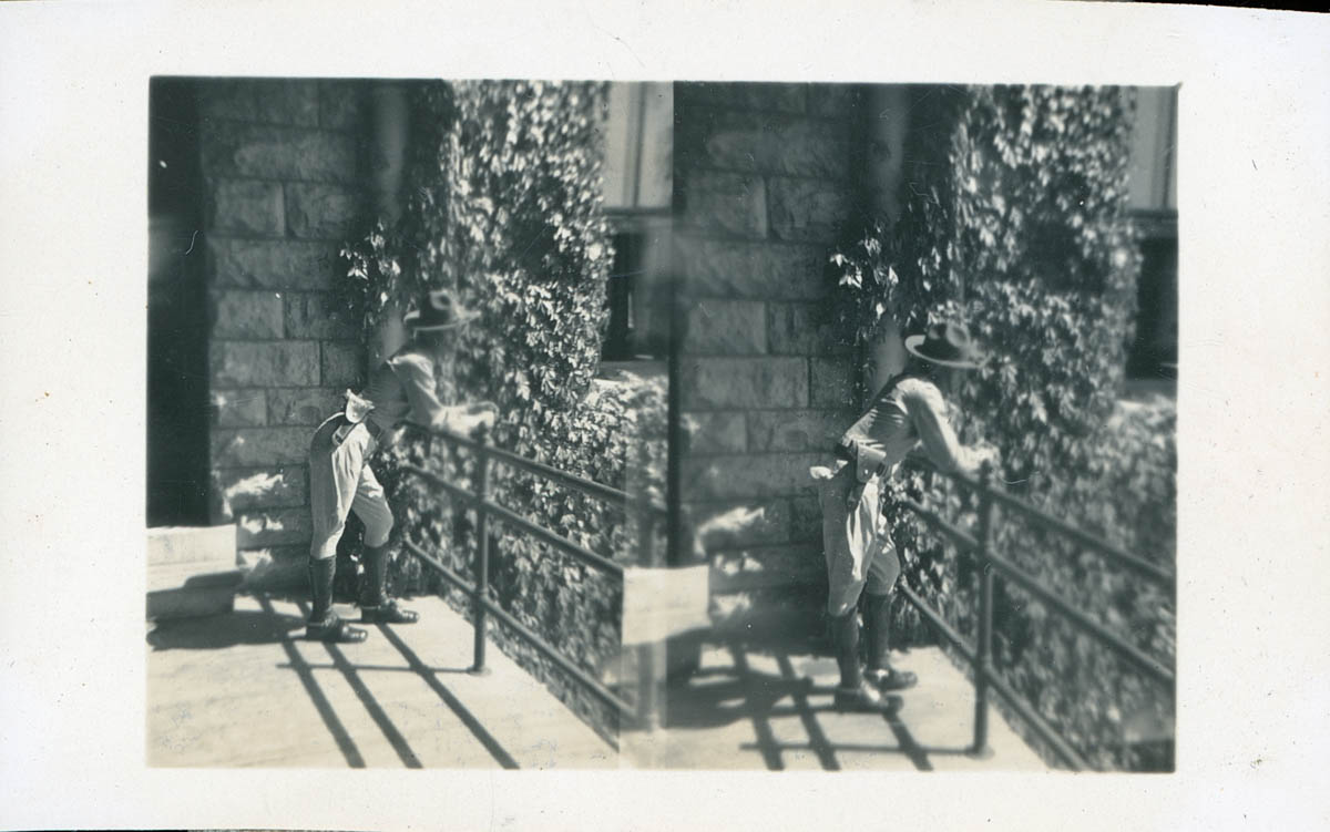 - Two snapshots of a man in a military uniform leaning against a railing. This is an item in a scrapbook compiled by Mr and Mrs John D Rensink.