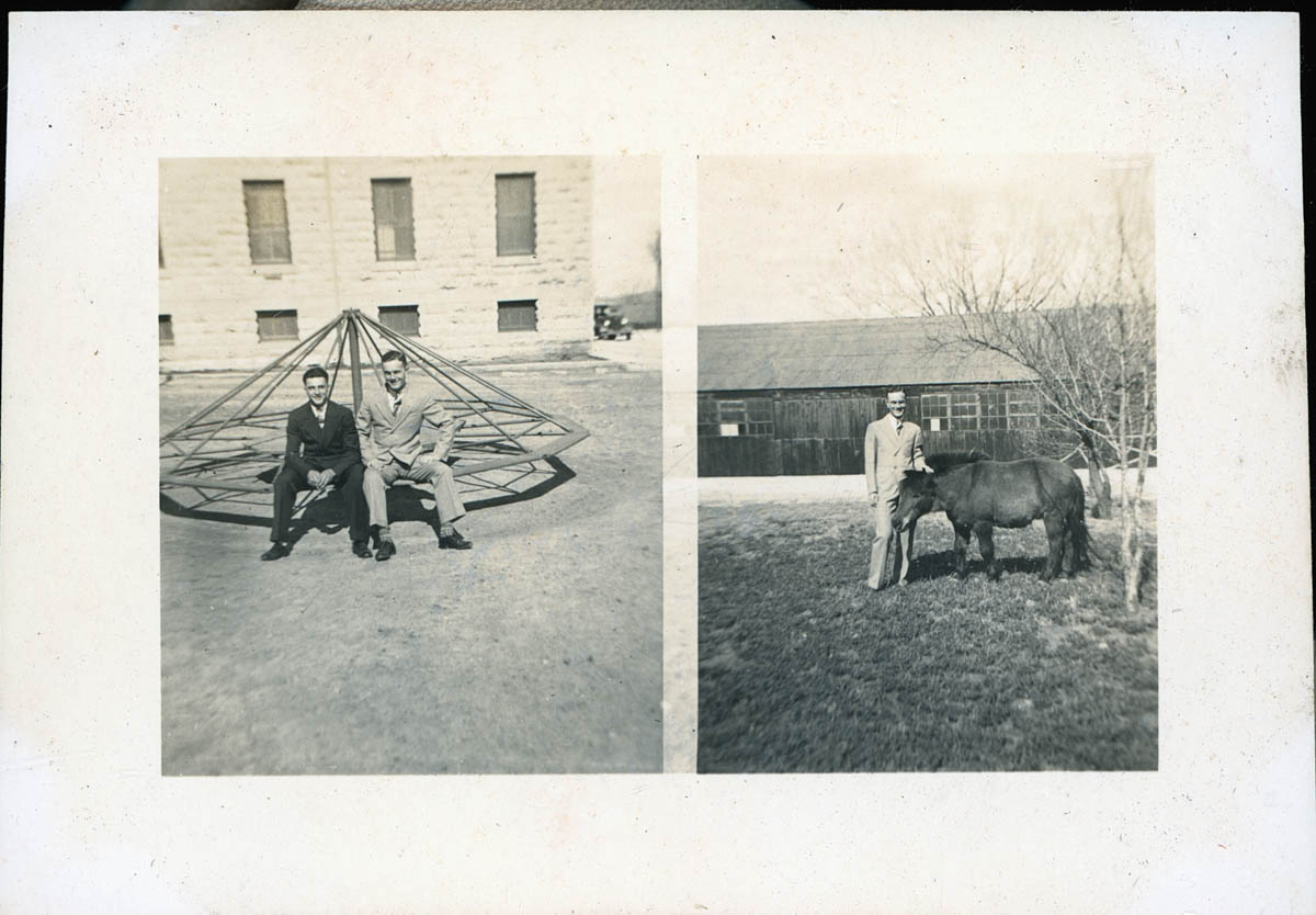 - Two snapshots -- two men sitting on a merry-go-round and a man standing by a small horse. This is an item in a scrapbook compiled by Mr and Mrs John D Rensink.