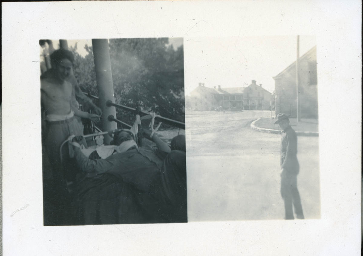 - Two snapshots -- two men horsing around with bandages and a man in a military uniform standing on a street. This is an item in a scrapbook compiled by Mr and Mrs John D Rensink.