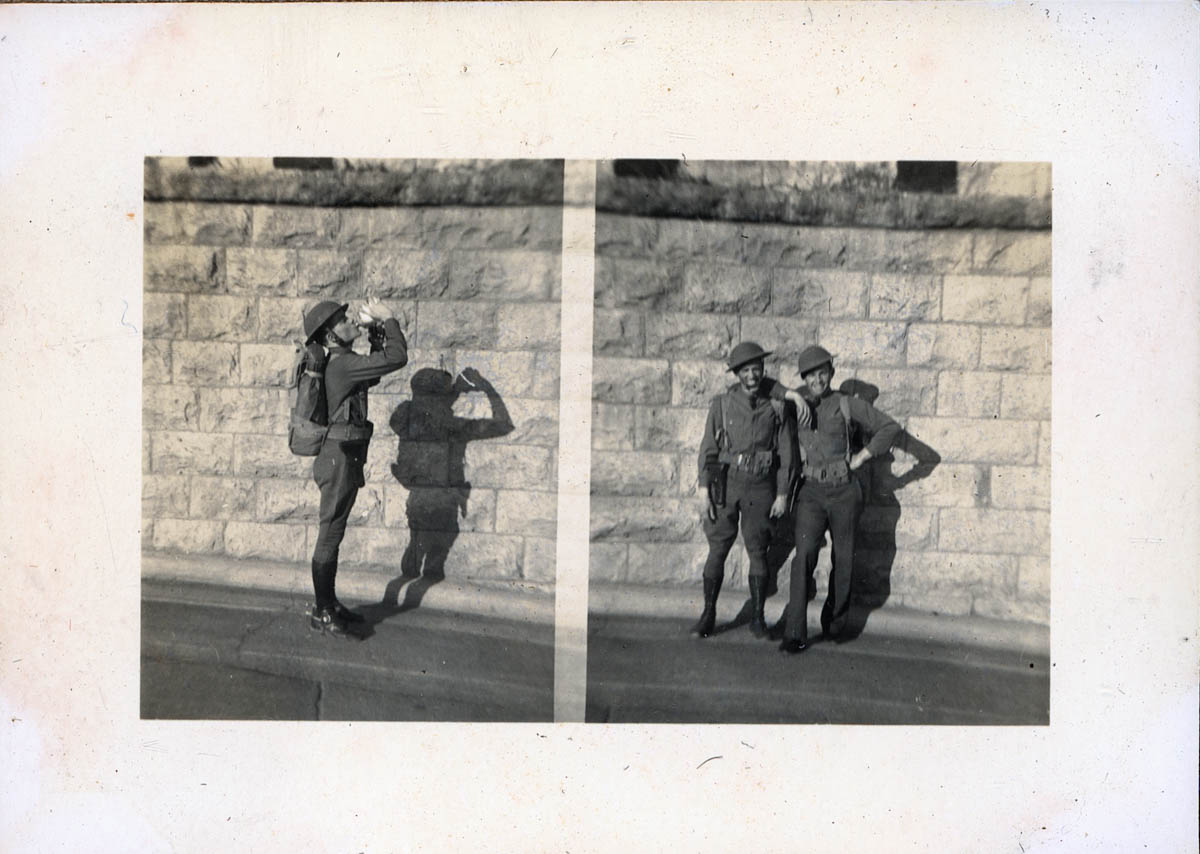- Two snapshots -- a man in a military uniform drinking from a canteen and two men in military uniforms standing in front of a stone wall. This is an item in a scrapbook compiled by Mr and Mrs John D Rensink.