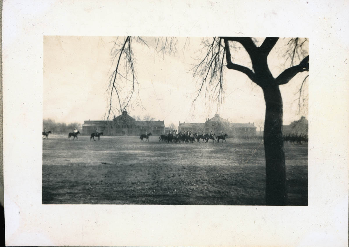 - Snapshot of men in military uniforms riding horses in formation in a large field. This is an item in a scrapbook compiled by Mr and Mrs John D Rensink.