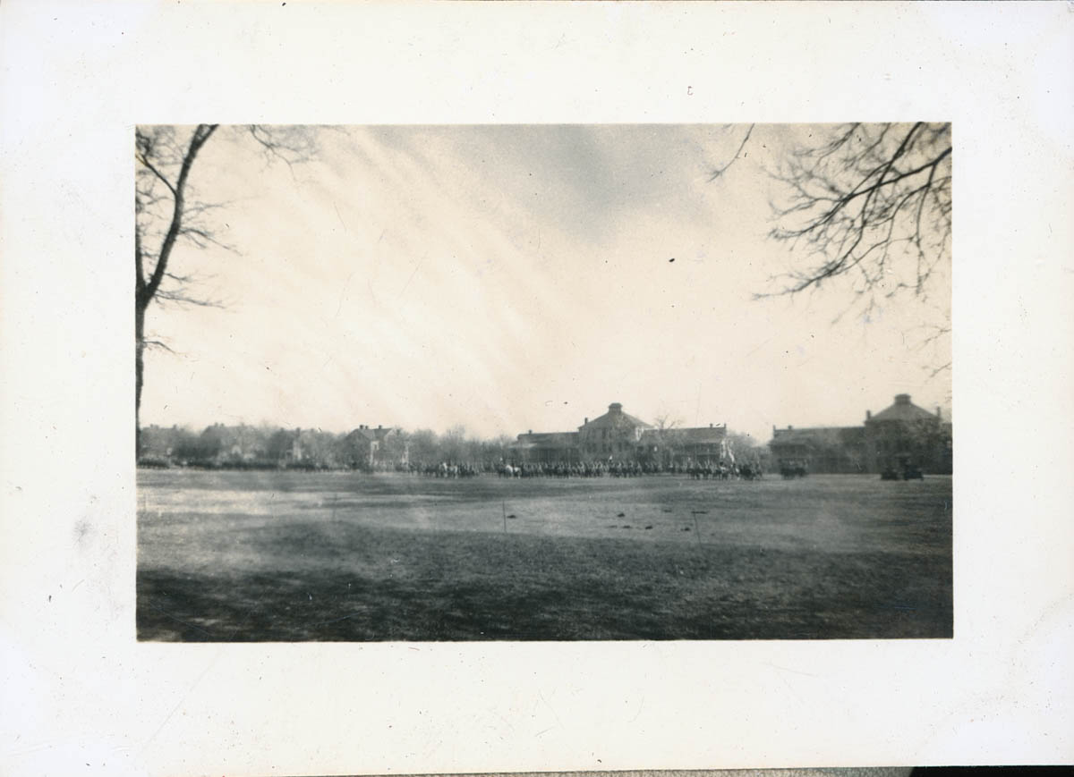 - Snapshot of men in military uniforms riding horses in formation in a large field. This is an item in a scrapbook compiled by Mr and Mrs John D Rensink.