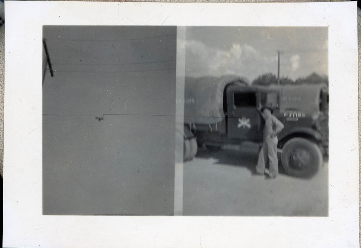 - Two snapshots -- one of an airplane and one of a man standing by a military truck. This is an item in a scrapbook compiled by Mr and Mrs John D Rensink.
