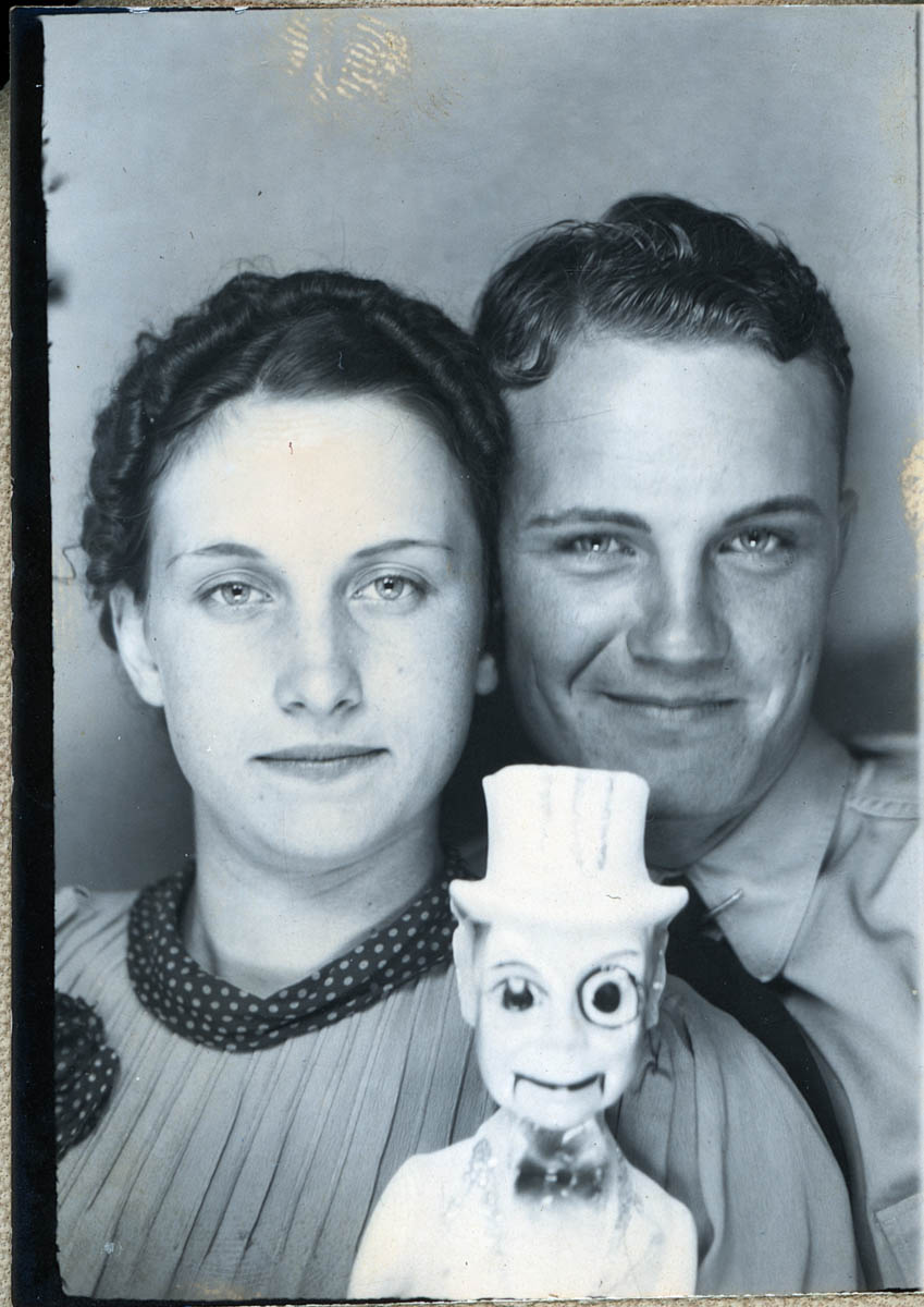 - Portrait of a man and woman holding a doll. This is an item in the front pocket of a scrapbook compiled by Mr and Mrs John D Rensink.