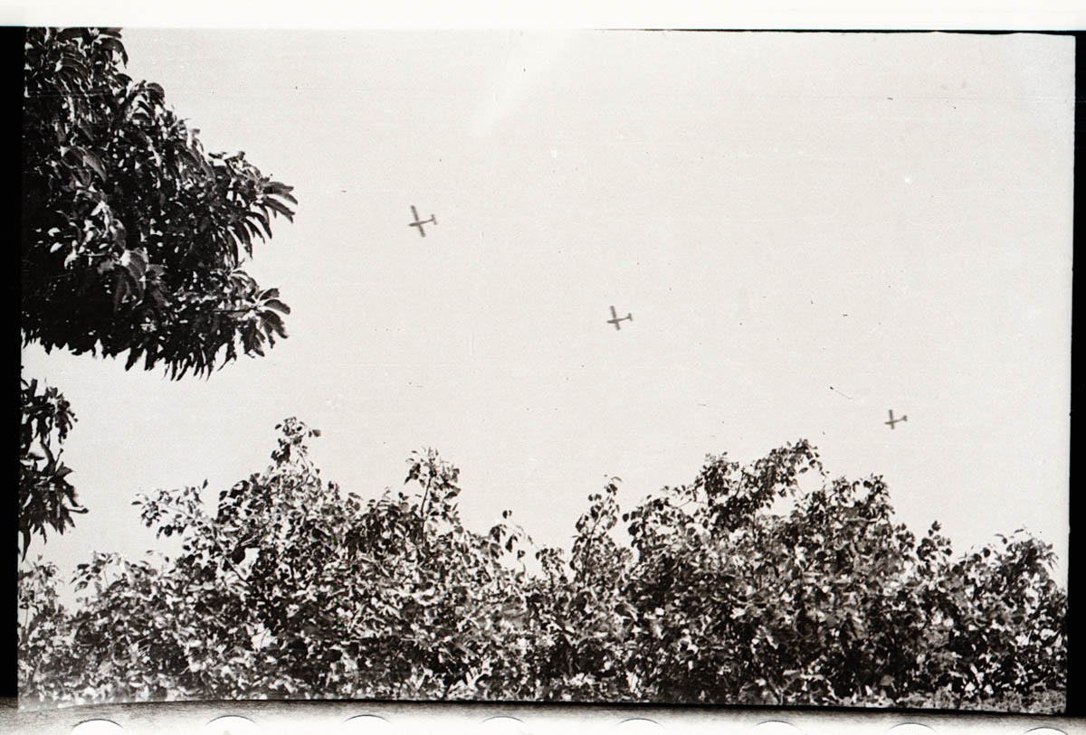 - Snapshot of three airplanes flying above trees. This is an item in a scrapbook compiled by Mr and Mrs John D Rensink.