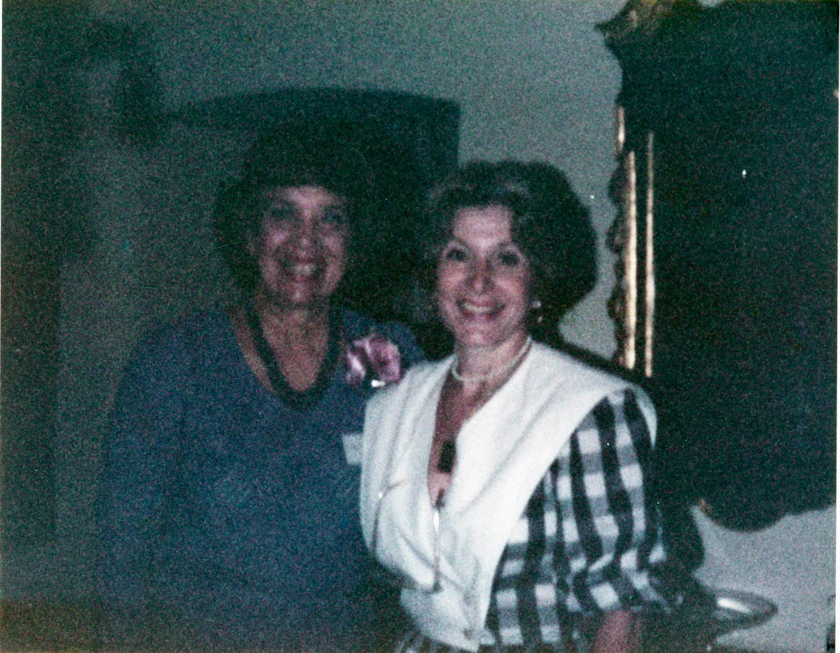 - Snapshot of two women. Handwritten label on scrapbook page says "Barbara Carlson showed the sculpture film many times." This photo is part of album MHGS_PB_1984-85.