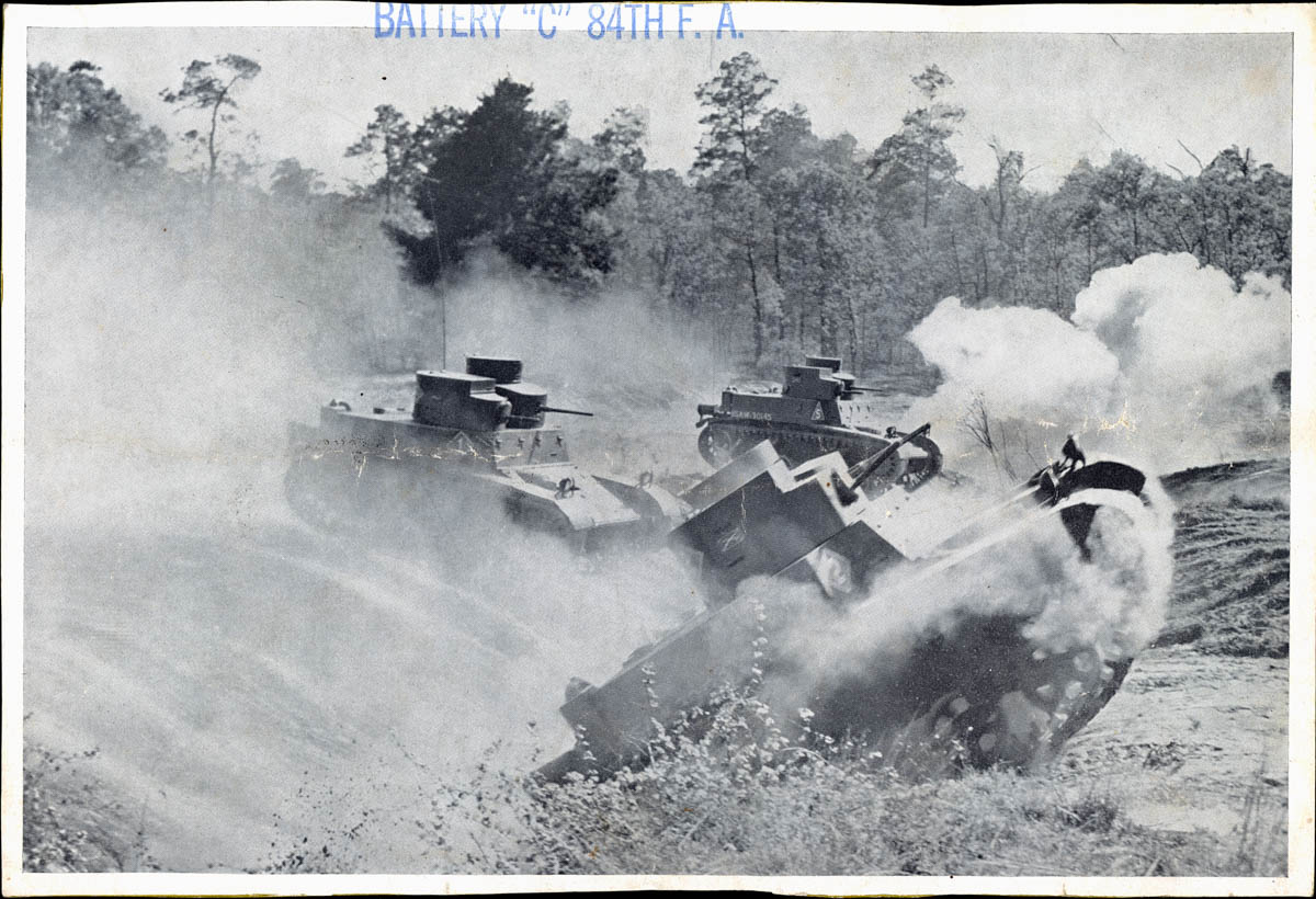- Published photograph of three tanks crossing a ditch. Stamped label on front says "Battery 'C' 84th F.A." This is an item in a scrapbook compiled by Mr and Mrs John D Rensink.