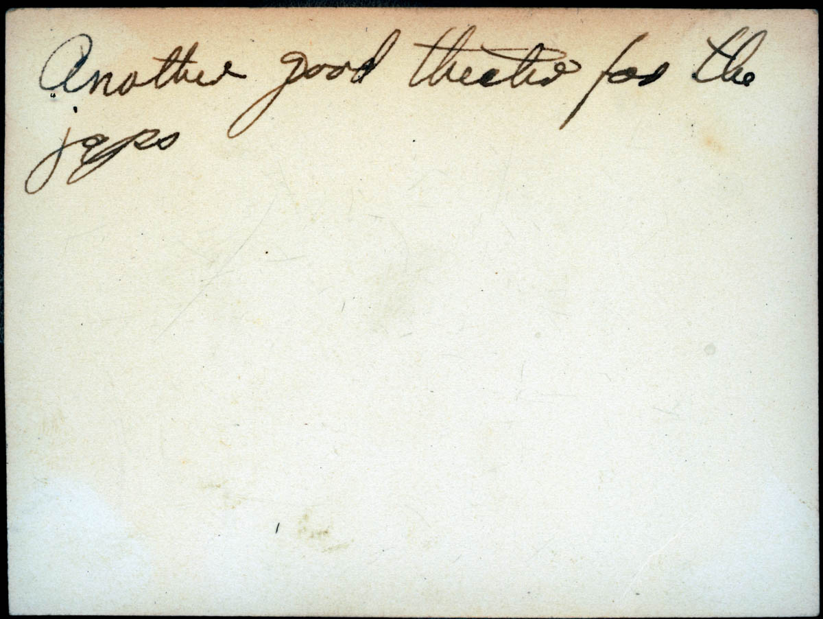 - Photograph of a grand circular theater building. Handwritten note on back says "Another good theater for the japs." This is an item in a scrapbook.
