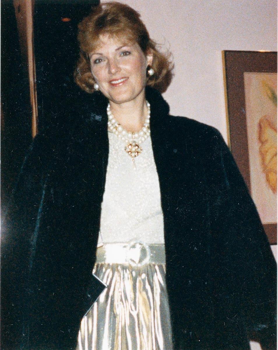 - Snapshot of a woman modeling a dress and furs at a party. This photo is part of album MHGS_PB_1983-1987.