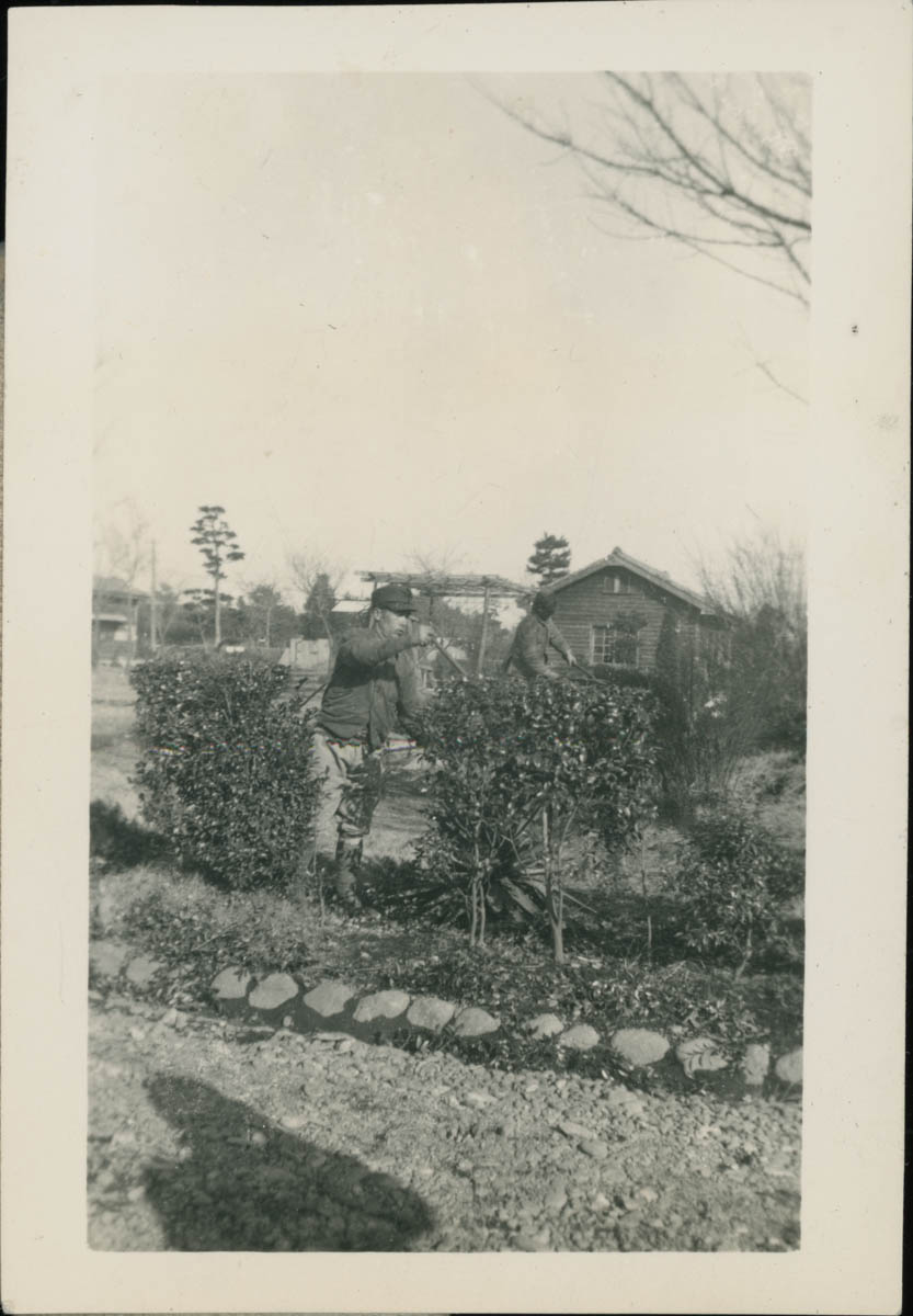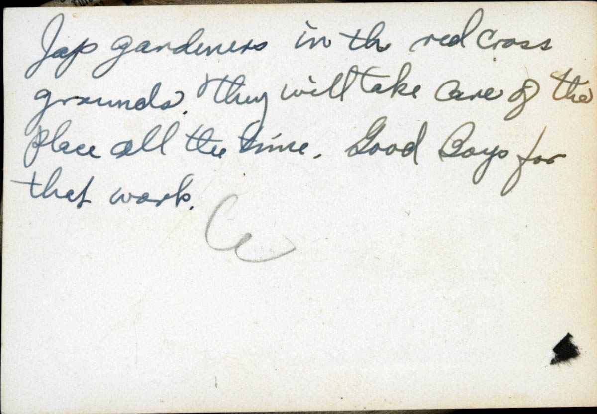 - Photograph of two men gardening on a military base. Handwritten label on back says "Jap gardeners in the Red Cross grounds. They will take care of the place all the time. Good boys for that work." This is an item in a scrapbook.