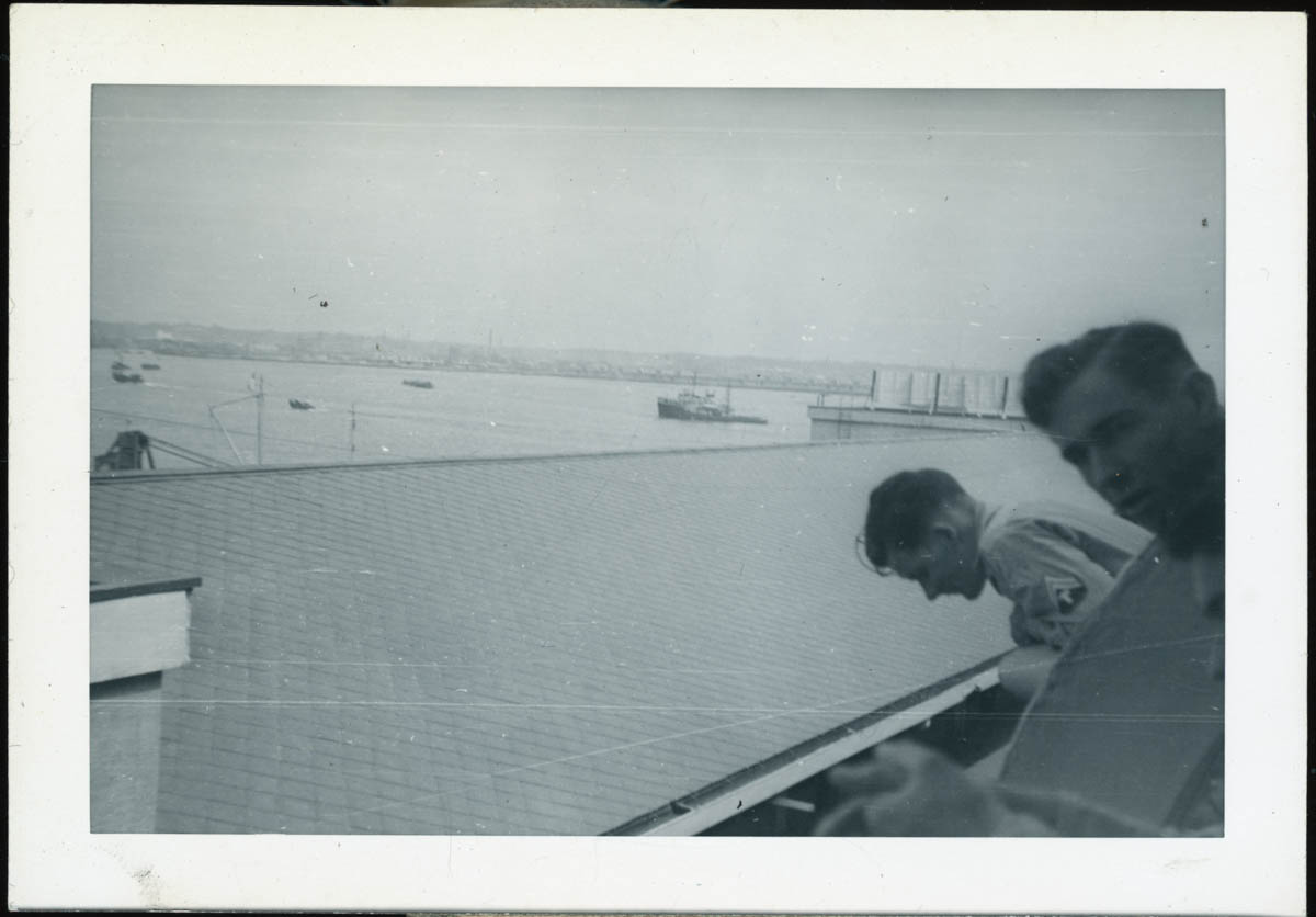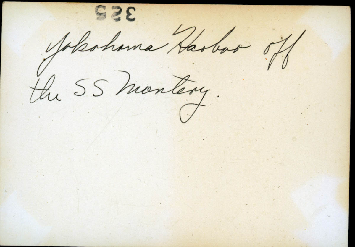 - Photograph of two men looking at a harbor. Handwritten label on back says "Yokohama Harbor off the SS Montery[sic]." This is an item in a scrapbook.
