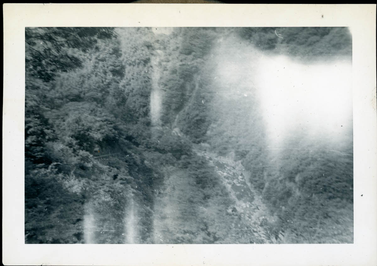 - Photograph of a stream and mountain. Handwritten label on back says "Stream at bottom of canyon. Cable cars at the left. Hotel at bottom. This is a Osio Japan" This is an item in a scrapbook.