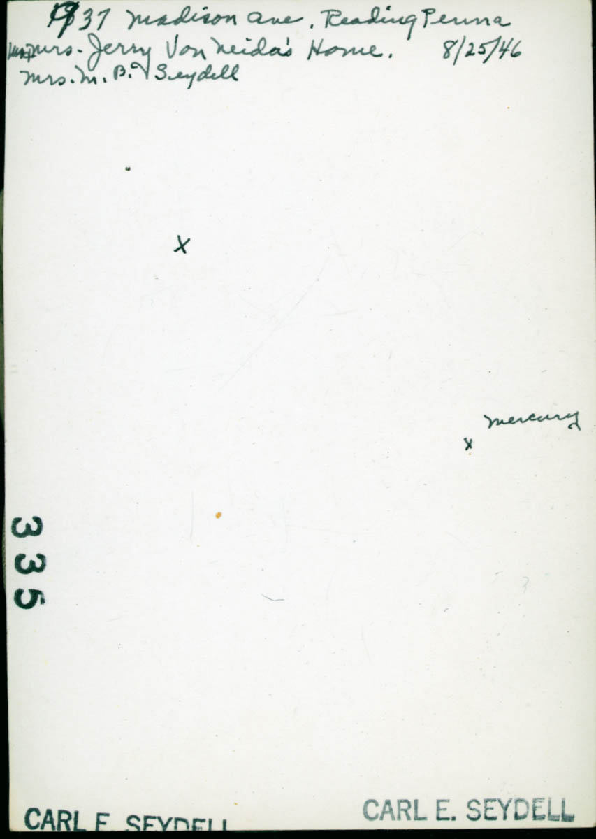 - Snapshot of cars on a street in front of a row of houses. Handwritten label on back says "937 Madison Ave. Reading Penna, Mr & Mrs. Jerry Von Neida's Home. Mrs. M.B. Seydell. 8/25/46. Carl E. Seydell."