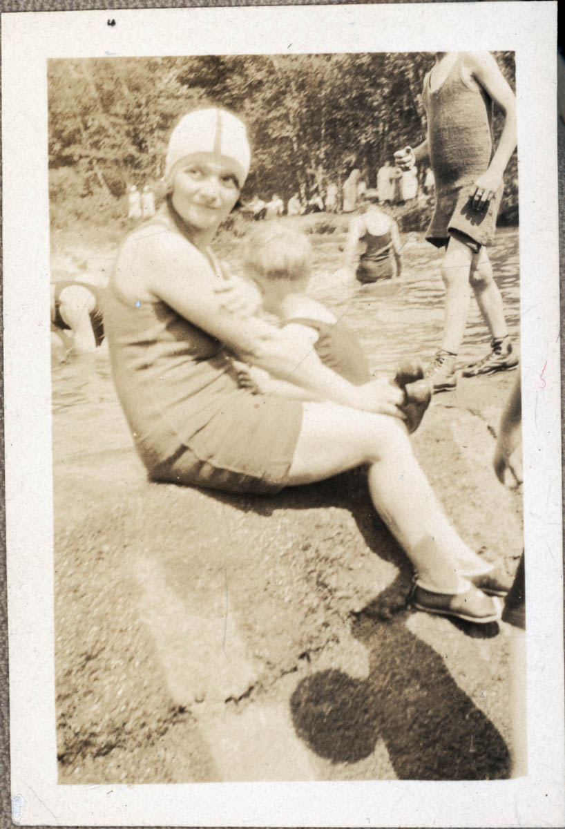 - Snapshot of a young woman in a bathing suit at a swimming hole. Handwritten label on back says "Tubby (me) in bathing suit"