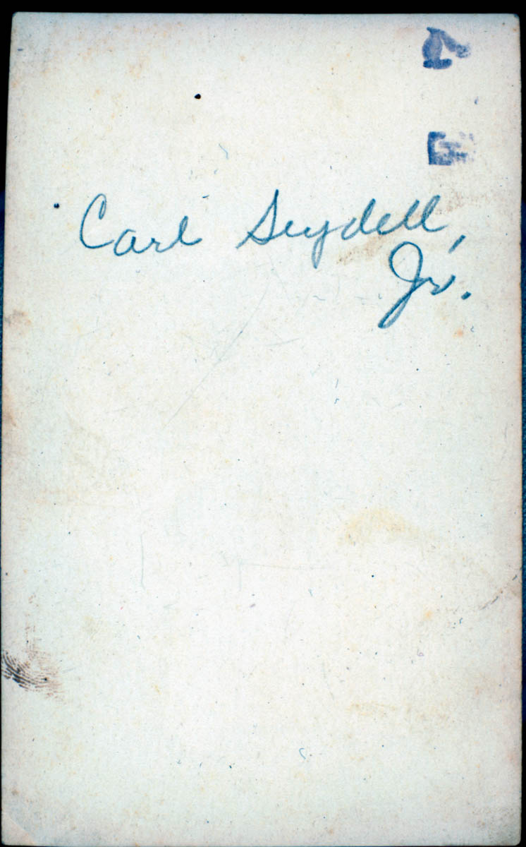 - Snapshot of a toddler sitting at table with a birthday cake. Handwritten label says "Carl Seydell Jr."