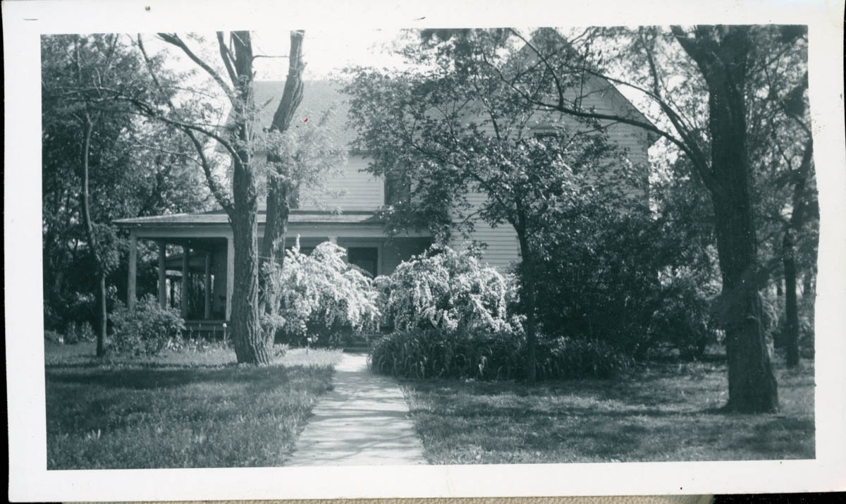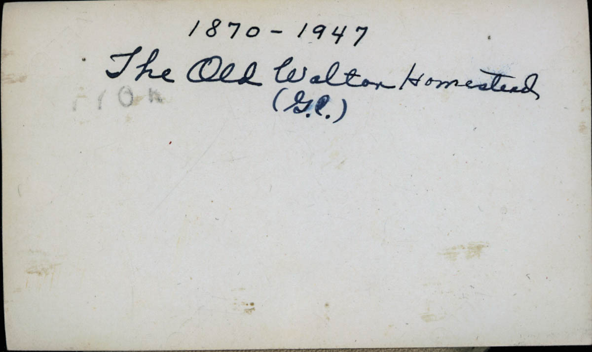 - Snapshot of a house. Handwritten label on back says "1870-1947 The Old Walton Homestead (G.C[?])."