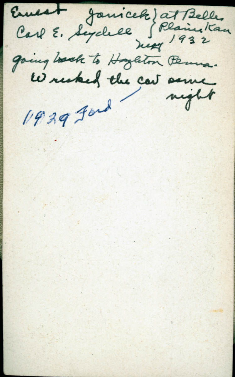 - Snapshot two men getting in to a car. Handwritten label on back says "Ernest Janicek, Carl E Seydell at Belle Plaine Kan May 1932. Going back to Hazelton Penna. Wrecked the car same night. 1929 Ford ."