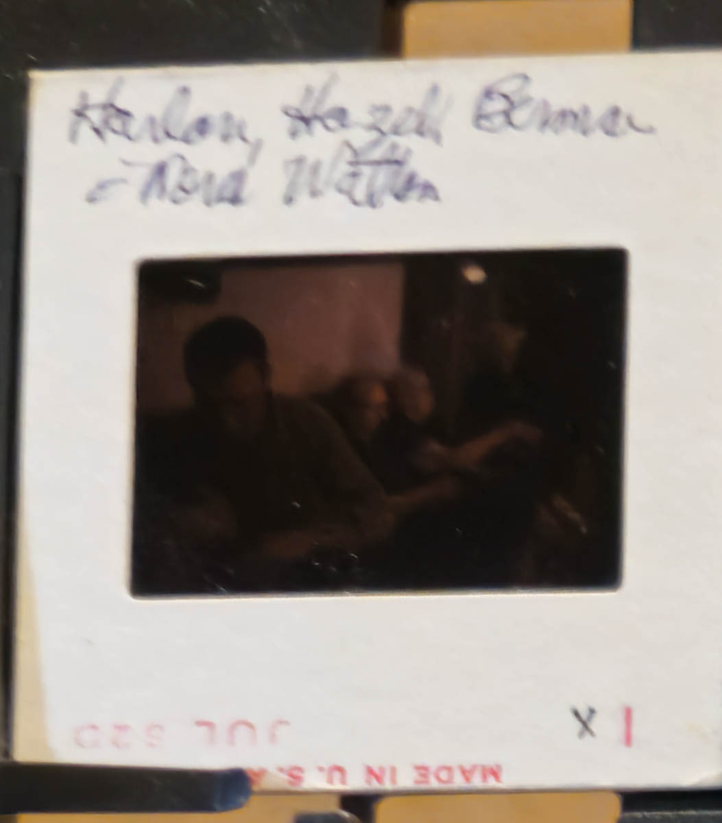 - Snapshot of a man and three women sitting on a couch. Handwritten label on slide says "Harlan, Hazel, Bernice & Nora Walton."