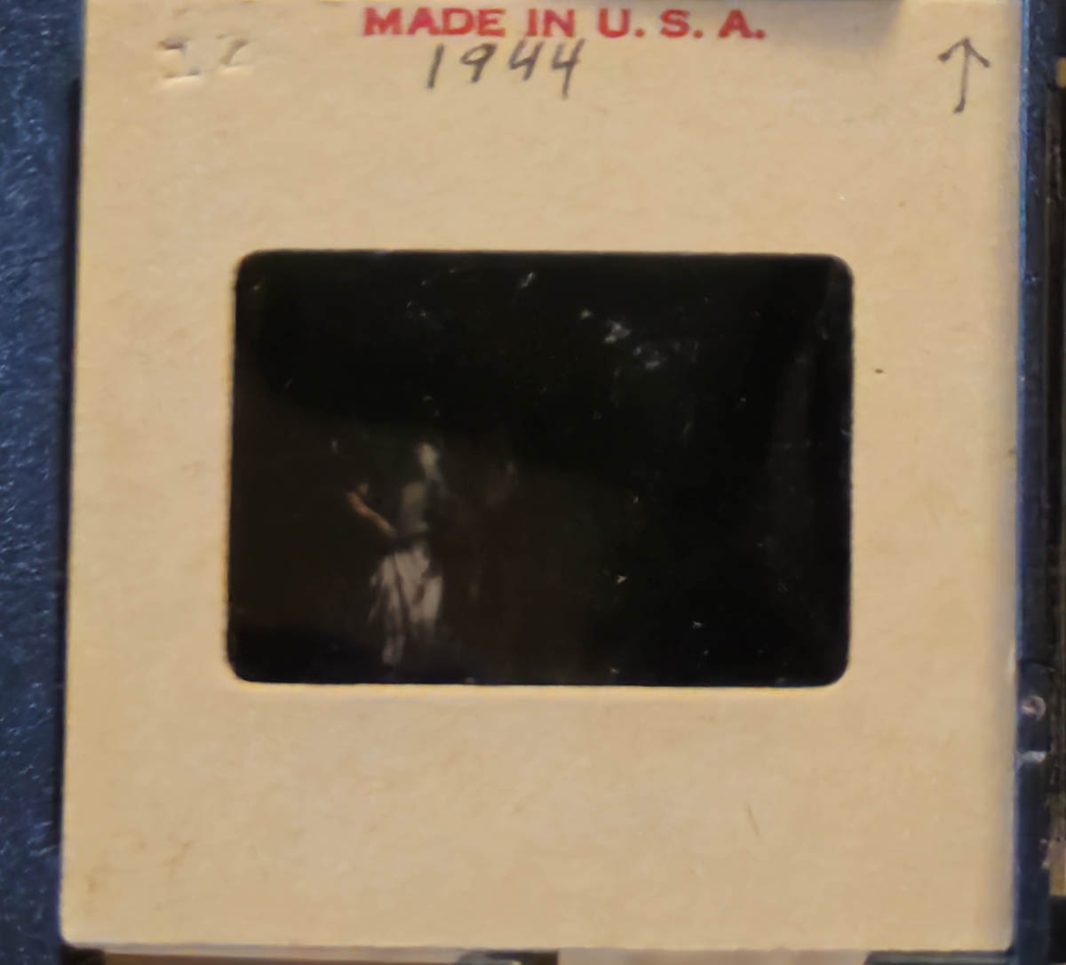 - Snapshot of three women. Handwritten label on slide says "1944."