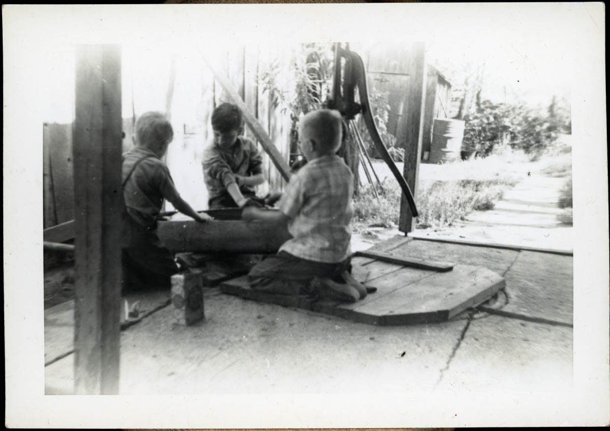 - Snapshot of boys playing on a porch. Handwritten label on back says "Play time on farm porch. Bruce -- Joe -- Dave."