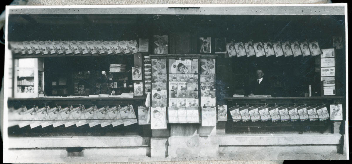 - Snapshot of men standing behind the counters of a newsstand. Handwritten label on back says "Taken by Carl Seydell."