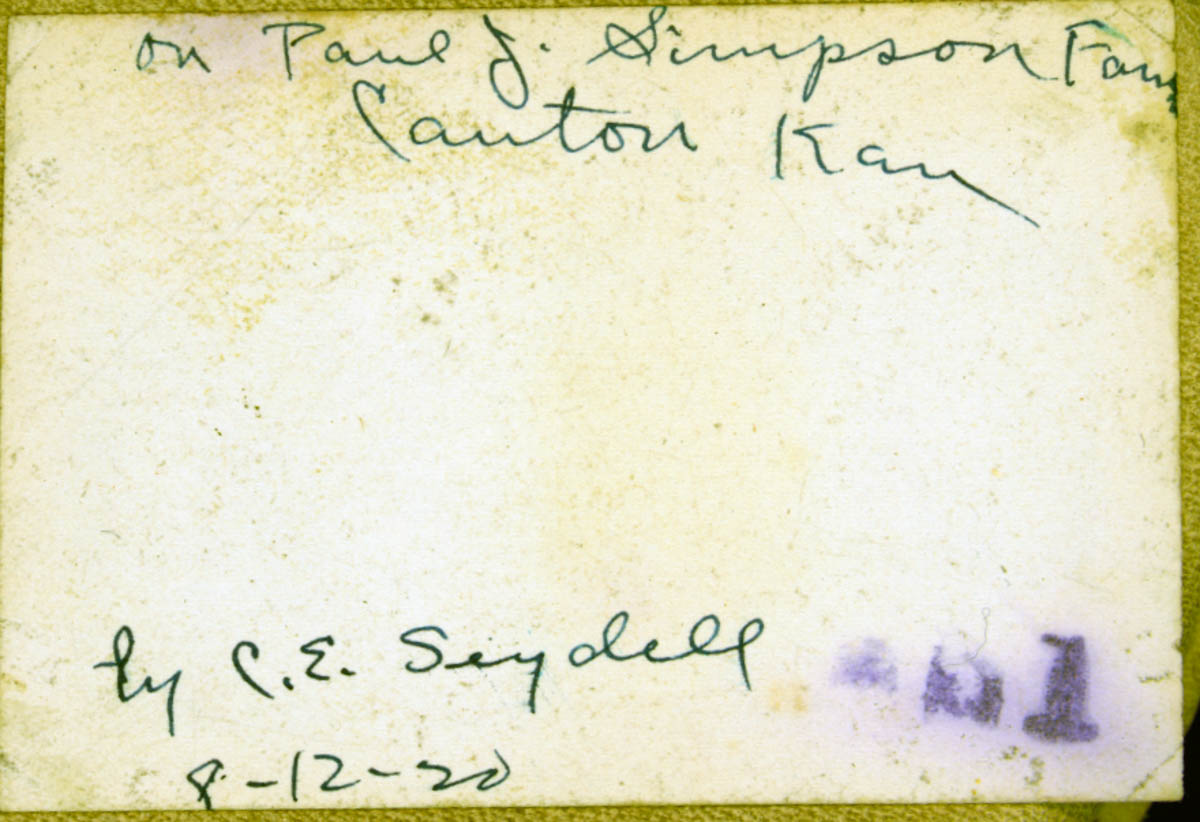 - Snapshot of five horses. Handwritten label on back says "On Paul J Simpson Farm, Canton, Kan by C.E. Seydell, 8-12-20."
