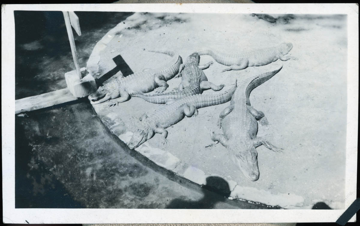 - Snapshot of alligators in a pit. Handwritten label on back says "In the zoo in Wichita, Kan. August 29, 1920. By C.E. Seydell."