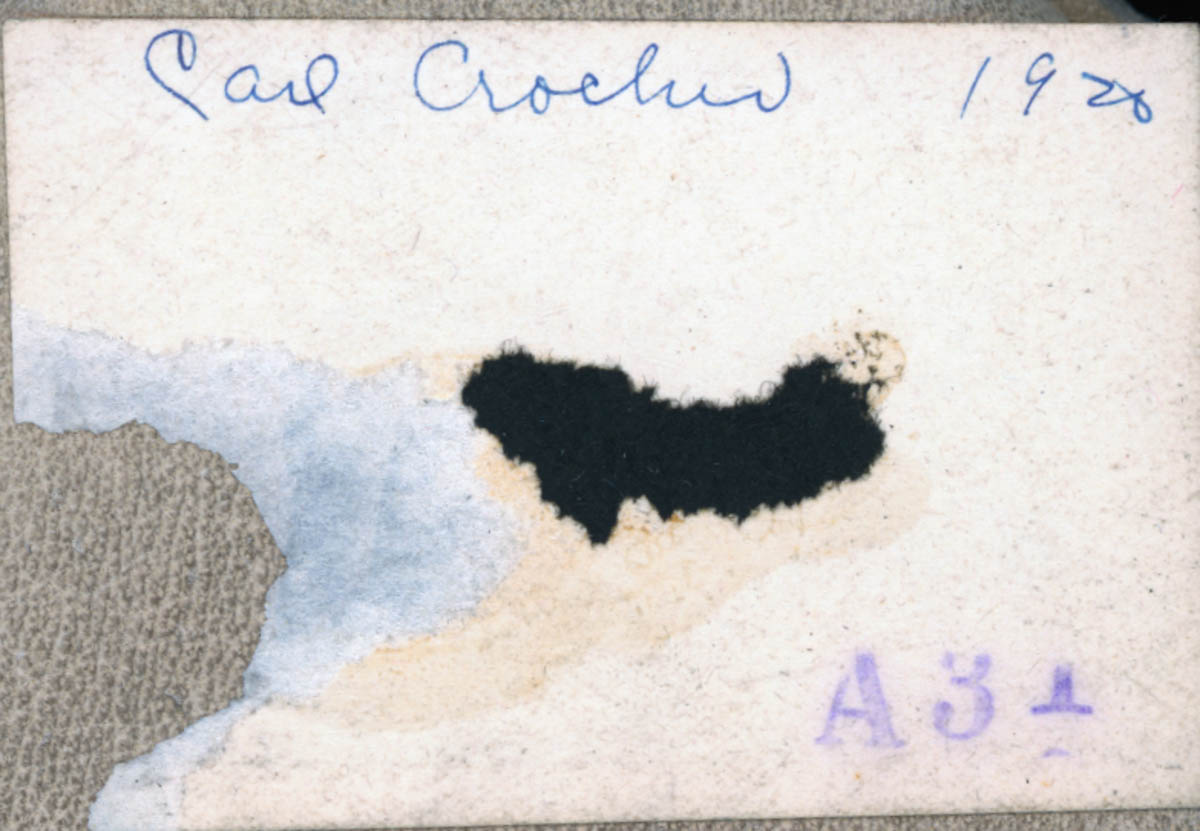 - Snapshot of a man standing in a field with small haystacks. Handwritten label on back says "Carl Crocker 1920."