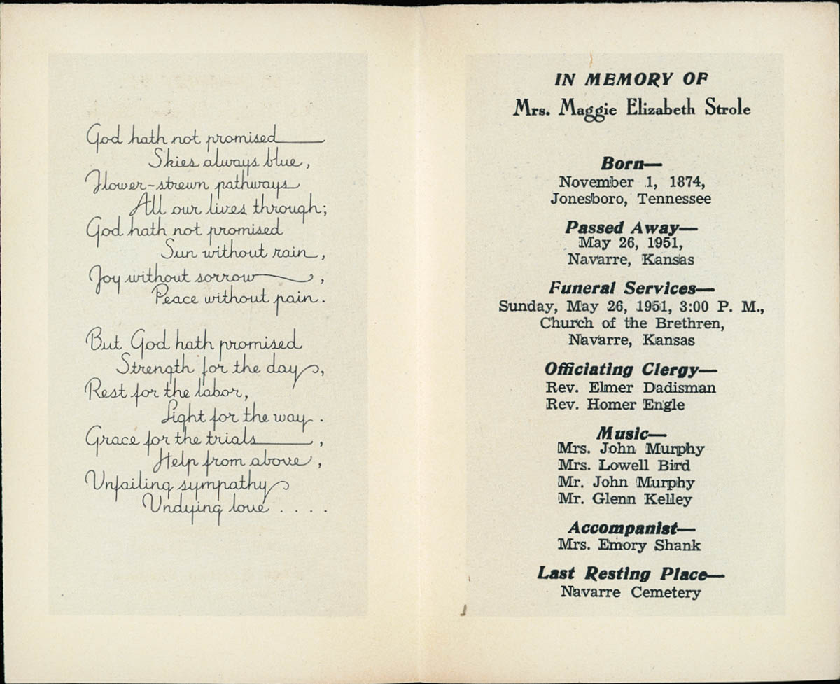 Wuthnow Funeral Service, “Funeral Program for Maggie Strole,” MHGS Digital Collections, accessed April 18, 2026, https://mhgswichita.org/om/items/show/16846.