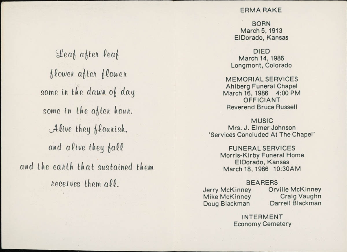 Morris-Kirby Funeral Home, “Funeral Program for Erma Rake,” MHGS Digital Collections, accessed April 18, 2026, https://mhgswichita.org/om/items/show/16851.