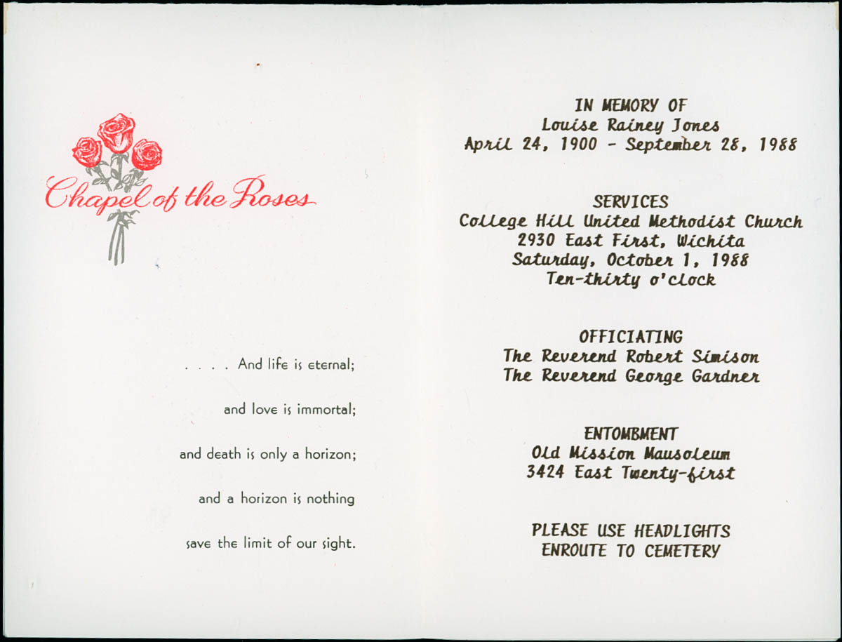 Cochran Mortuary, “Funeral Program for Louise Rainey Jones,” MHGS Digital Collections, accessed April 18, 2026, https://mhgswichita.org/om/items/show/16856.