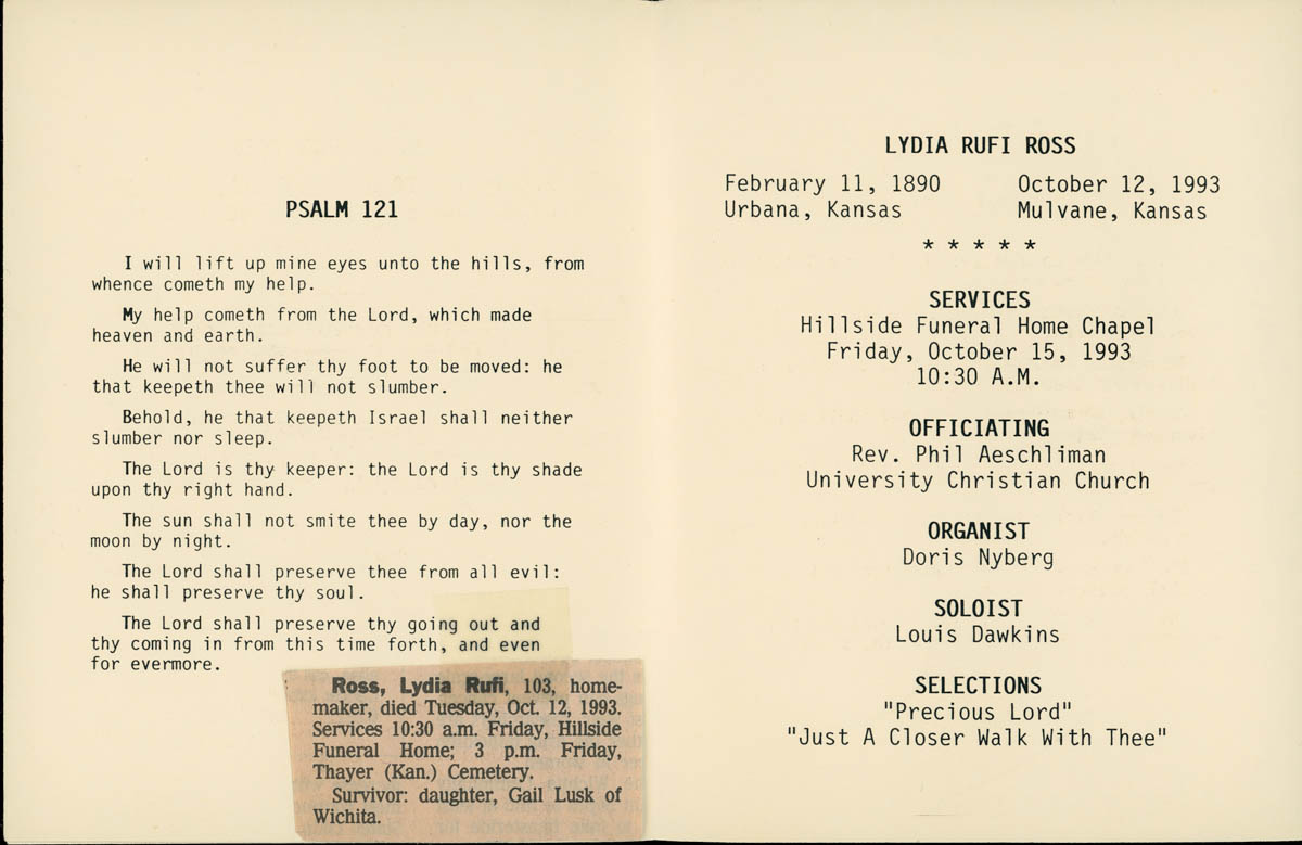 Hillside Funeral Home, “Funeral Program for Lydia Rufi Ross,” MHGS Digital Collections, accessed April 17, 2026, https://mhgswichita.org/om/items/show/16880.