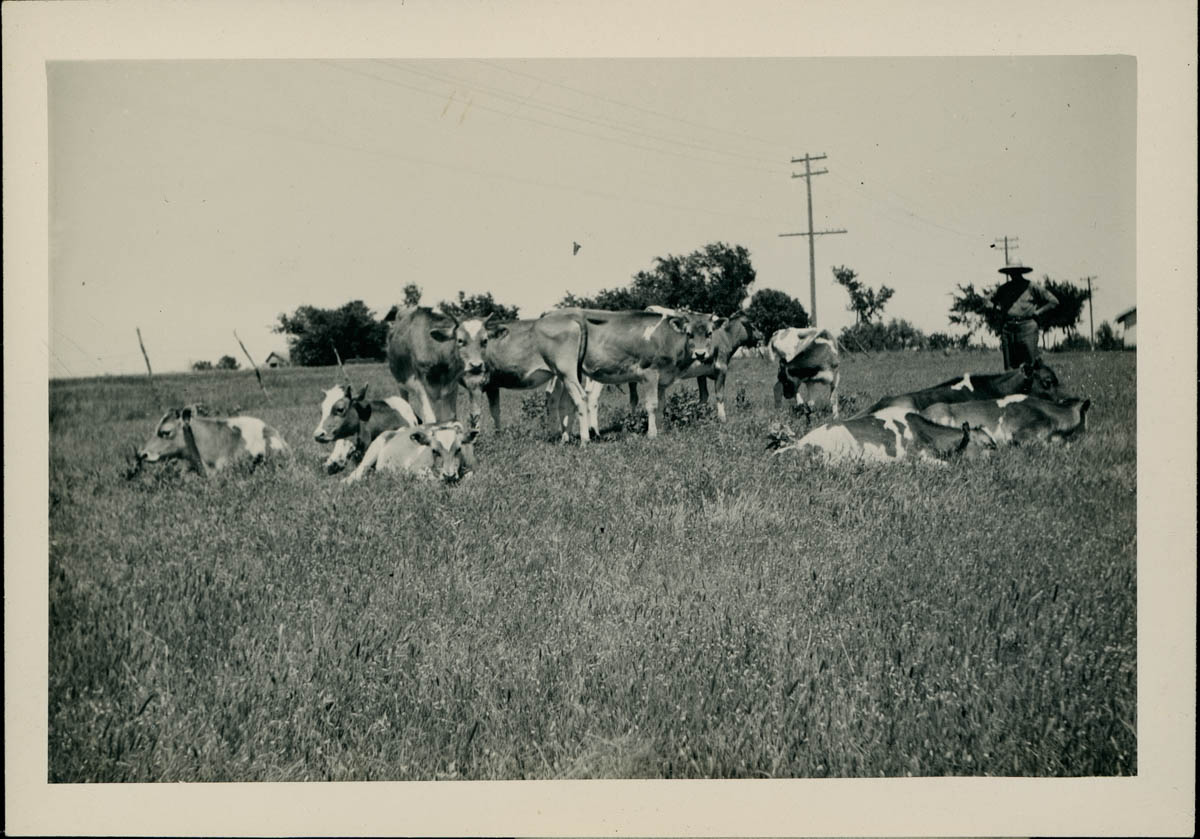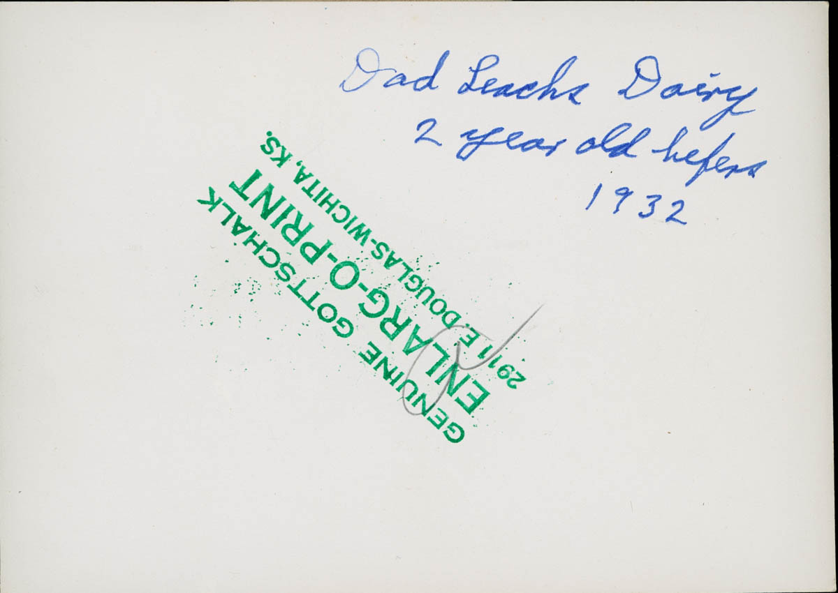 - Snapshot of a man standing in a field surrounded by cattle. Handwritten label on back says "Dad Leach's Dairy 2 yr. old hefers 1932" and photographer stamp says "Genuine Gottschalk Enlarg-o-print 2911 E Douglas Wichita KS"