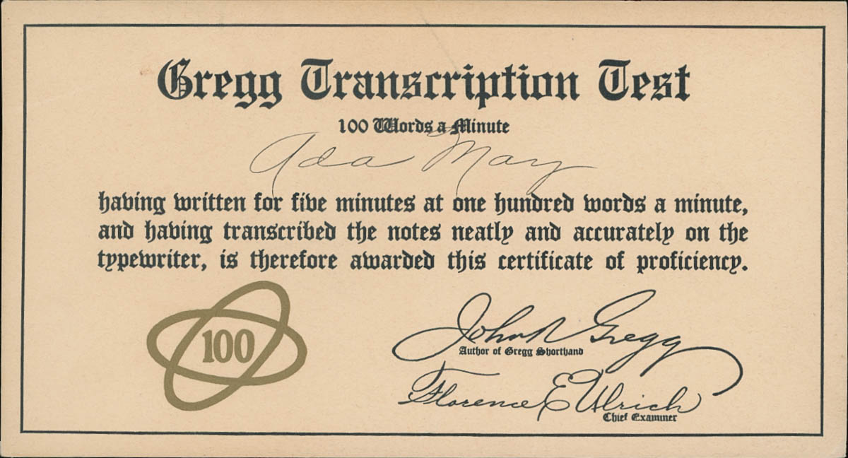 - Certificate of proficiency for transcribing 100 words per minute of shorthand.