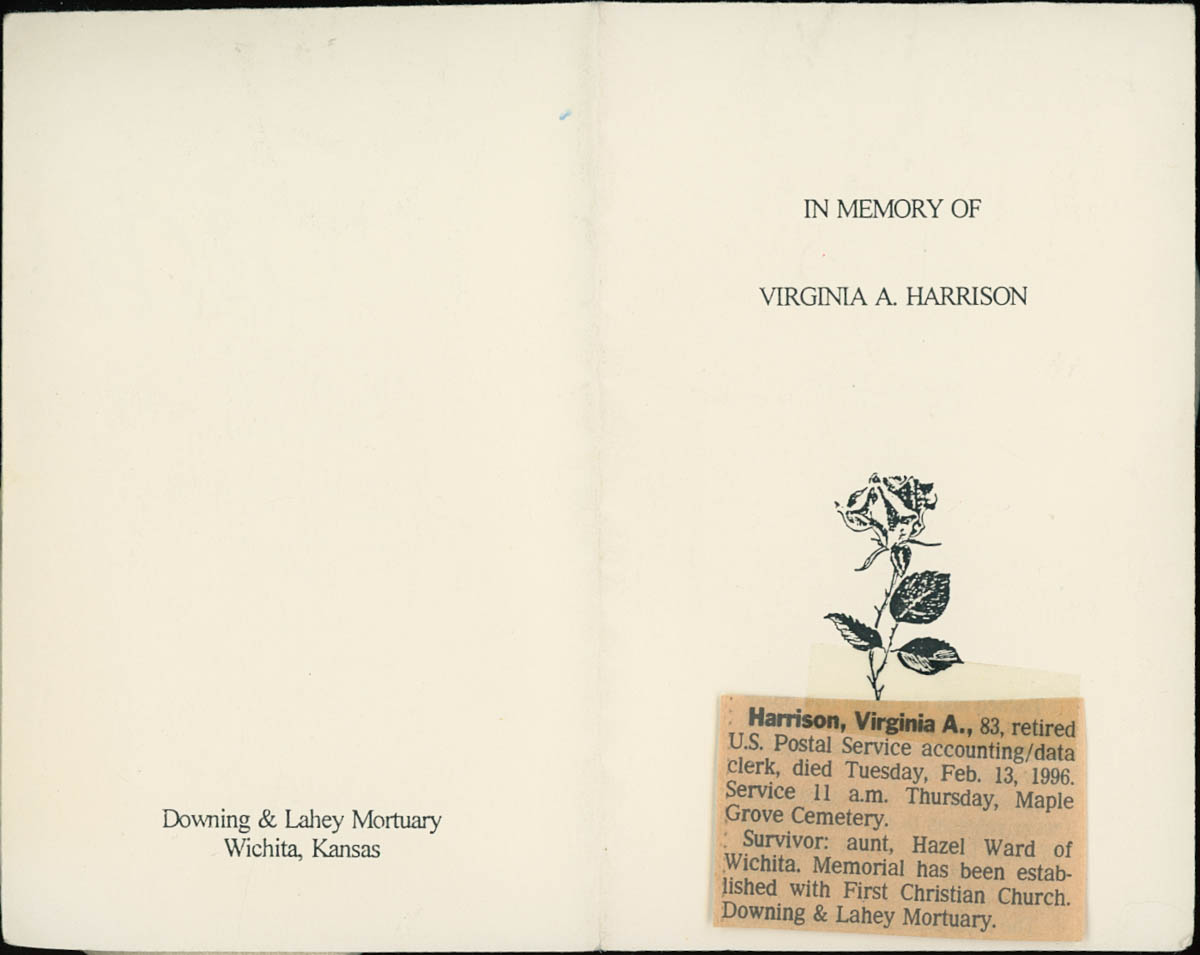 Downing & Lahey Mortuary, “Funeral Bulletin for Virginia Harrison,” MHGS Digital Collections, accessed April 30, 2026, https://mhgswichita.org/om/items/show/17126.