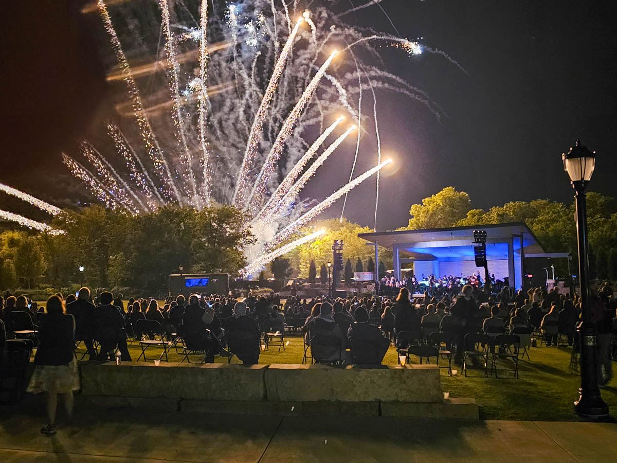- Photograph of an orchestra playing in a botanical garden with fireworks in the background.