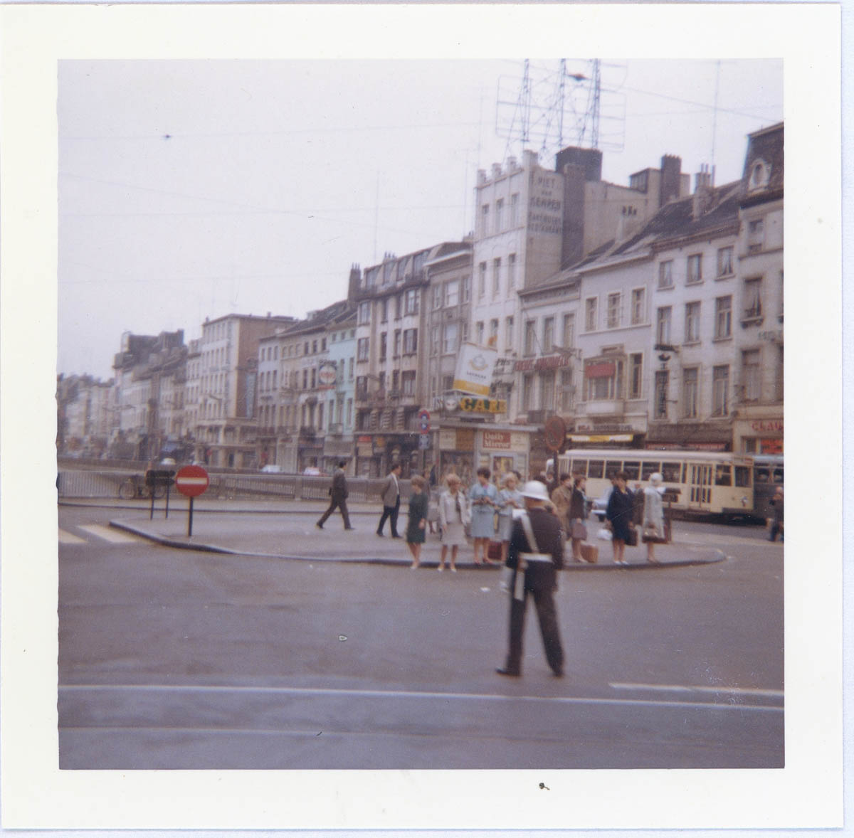 - Photograph of a city street. Handwritten label on page says "Brussels, Belgium June 13, 1965." This is an item in a scrapbook.