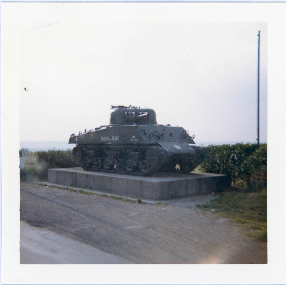 - Photograph of a tank on a pedestal. Handwritten label on page says "Memorial to General Patton, Savern, France." This is an item in a scrapbook.
