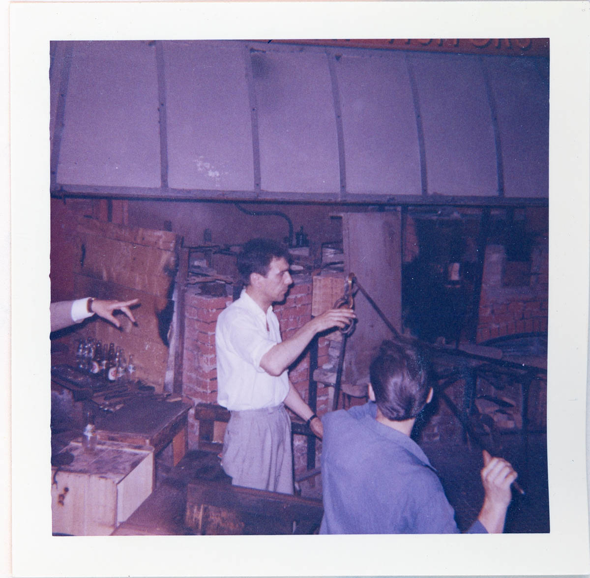 - Photograph of two men working with blown glass. Handwritten label on page says "Venice Italy June 16 & 17 -- The Glassblowers." This is an item in a scrapbook.