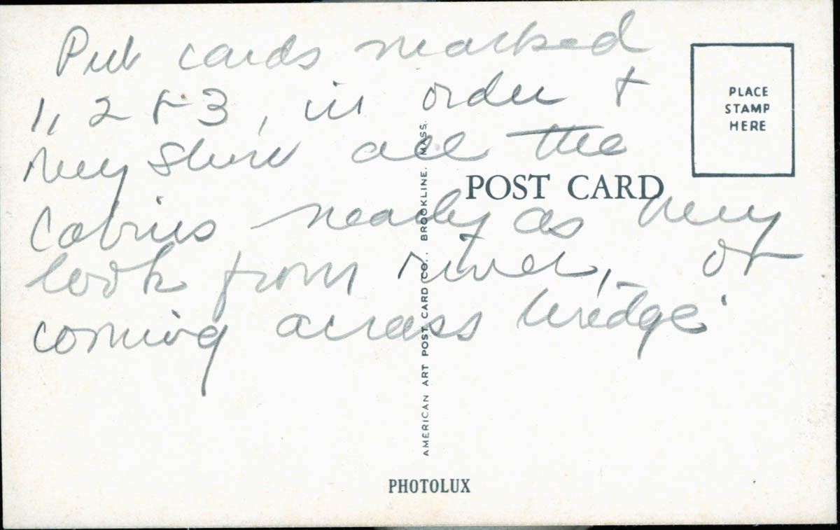 - Postcard view of a row of vacation cabins along a river. This item was enclosed in a letter from Larry Davis to Lemuel Stump.