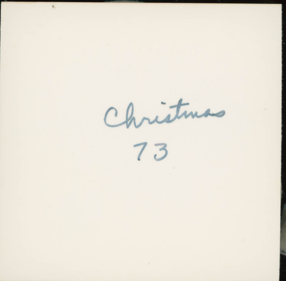 - Photograph of a dog standing on a snowy street. Handwritten label on back says "Christmas 73."