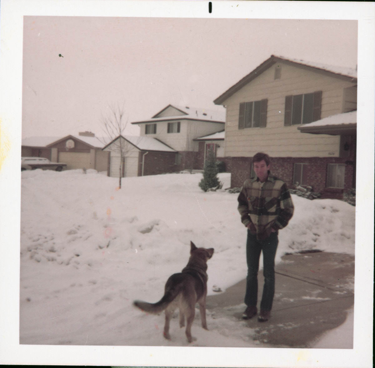- Photograph of a man and a dog on a snowy driveway. Handwritten label on back says "Winter 73."