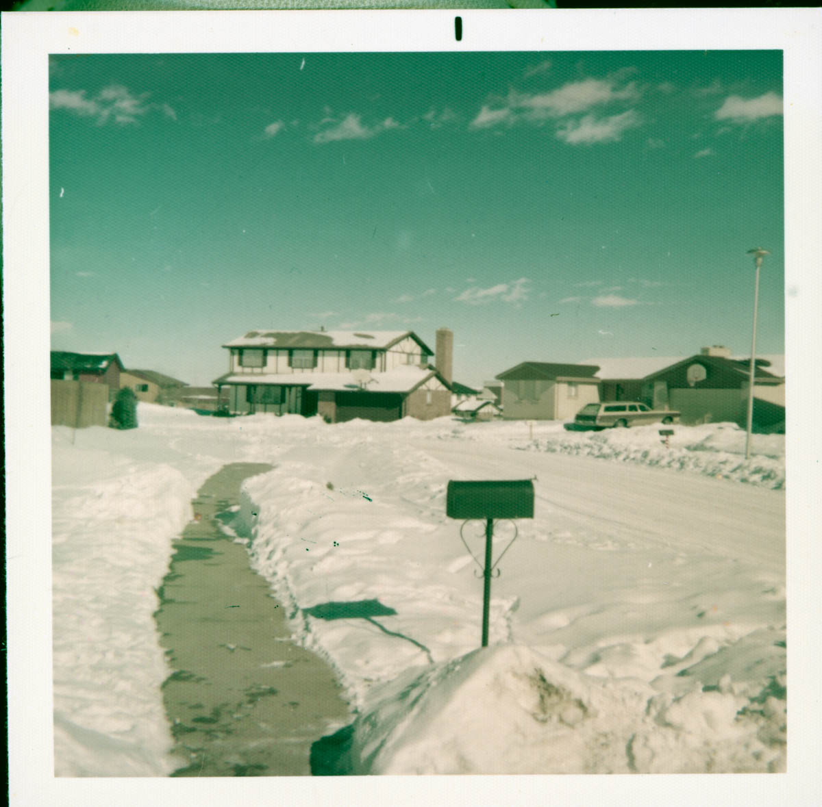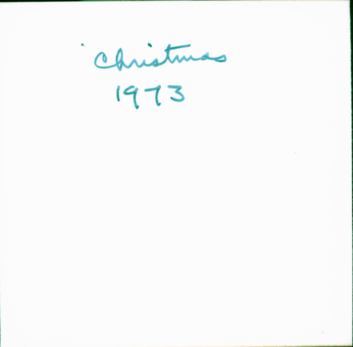- Photograph of two houses in the snow. Handwritten label on back says "Christmas 73."