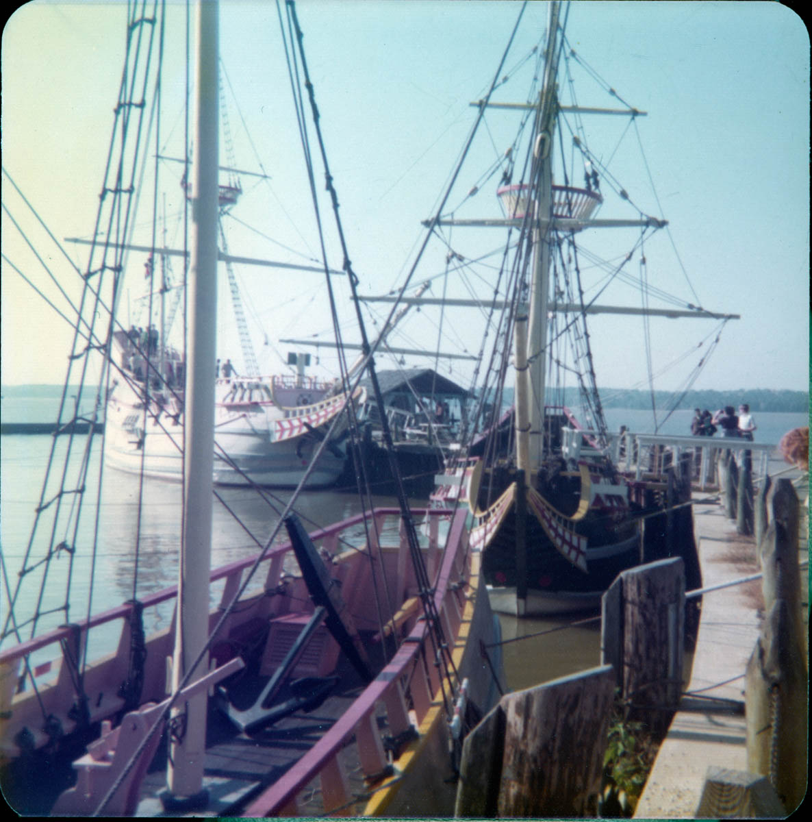 - Photograph of three ships at a dock at Jamestown Settlement.